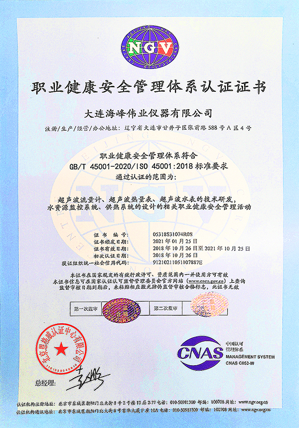 職業(yè)健康安全管理體系認(rèn)證證書(shū)-大連海峰